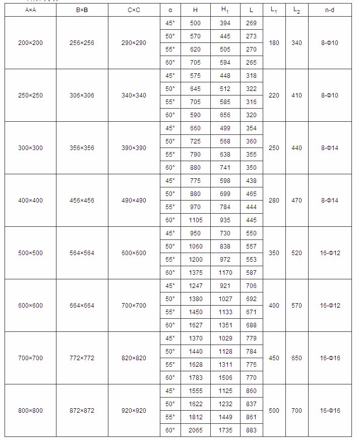 700×700 | 772×772 | 820×820 | 45° | 617 | 380 | 450 | 630 | 16-Ф16 | DTⅡA500-M | 0.75 |