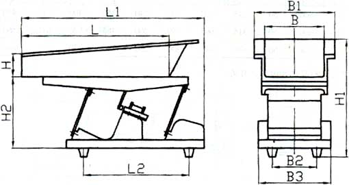 電磁振動(dòng)給料機(jī)的振幅和給料量受料倉倉壓影響較大,設(shè)計(jì)料倉時(shí)應(yīng)盡量減少倉壓,使溜咀后側(cè)板承受一定的倉壓,并設(shè)置斜溜沮及下料閘門。如圖,一般a=1/4b。溜咀四周應(yīng)與給料槽留有一定的間隙,一般5~10mm,以免產(chǎn)生噪音及影響振動(dòng)。