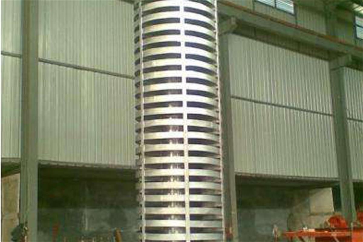 垂直振動(dòng)輸送機(jī)是通過(guò)激振器強(qiáng)迫振動(dòng),使輸送塔作沿垂直方向的直線振動(dòng)和繞鉛垂中心軸的扭動(dòng)振動(dòng),兩個(gè)振動(dòng)的合成,使物料朝        螺旋運(yùn)動(dòng)的方向斜拋,形成了物料沿螺旋槽向上的輸送過(guò)程。垂直振動(dòng)輸送機(jī)是由提升槽、振動(dòng)電機(jī)、減振系統(tǒng)和底座等組成。垂直振動(dòng)輸送機(jī)分開(kāi)槽式、封閉式兩種結(jié)構(gòu)。